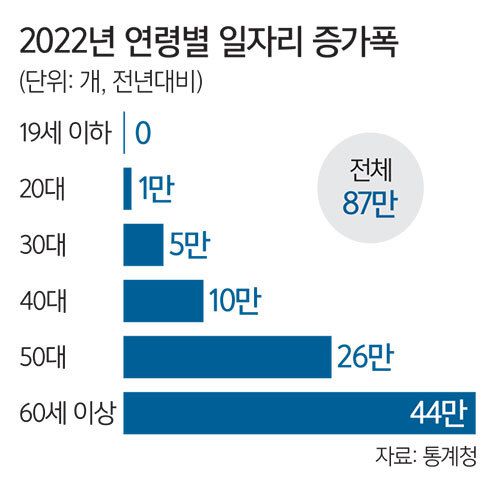 지난해 87만개의 일자리가 늘었지만 이 가운데 절반 이상은 ‘노인 일자리’였다. 일자리 통계 작성 이래 최초로 50대가 가장 큰 비중을 차지한 것으로 나타났다. 모두 ‘저출산·고령화’의 영향이라는 분석이다.