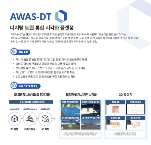 아울러 3D 자동 생성 엔진(Auto-i3D)과 영상 분석 엔진(AWAS-Insight)을 기반으로 교육 훈련 시뮬레이션(AWAS-XR)를 비롯해 다양한 물리 보안을 유기적으로 연동해 한 번에 통합 관제할 수 있는 초정밀 디지털 통합 플랫폼으로 통한다.