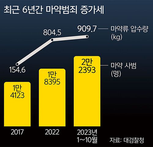 올해 1∼10월 적발된 마약 사범은 2만2393명에 달했다. 전년 동기(1만5182명) 대비 47.5% 증가했다. 2017년 1만4123명이던 마약 사범은 지난해엔 1만8395명을 기록했고, 올해 사상 처음 2만명대에 진입했다.