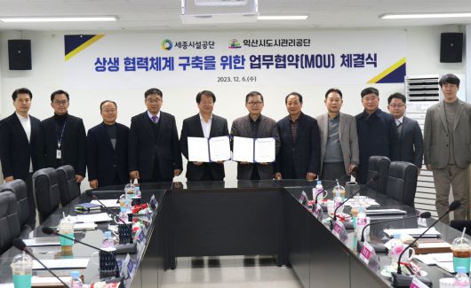 (세종=국제뉴스) 정지욱 기자 = 세종특별자치시시설관리공단(이사장 조소연)과 익산시도시관리공단(이사장 심보균)이 6일 세종과 익산의 시설관리 전문 공기업 간 상생 협력체계 구축을 위해 세종시설공단 본부인 조치원청사에서 상호 교류 및 협력 증진에 관한 업무협약을 체결했다.