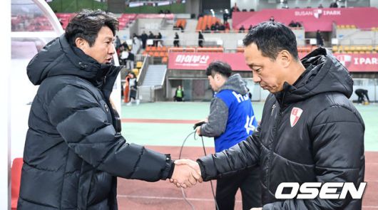 [OSEN=부산, 이석우 기자] 6일 부산아시아드주경기장에서 K리그 승강 플레이오프(PO) 1차전 부산 아이파크와 수원FC의 경기가 열렸다. 수원FC 김도균 감독과 부산 아이파크 박진섭 감독이 인사를 하고 있다. 2023.12.06 / foto0307@osen.co.kr