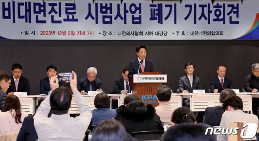 (서울=뉴스1) 장수영 기자 = 김동석 대한개원의협의회 회장이 6일 오후 서울 용산구 대한의사협회 대강당에서 비대면진료 시범사업 폐기 기자회견을 하고 있다. 대한개원의협의회는 보건복지부가 의사들과 협의 없이 일방적으로 비대면 진료를 대폭 확대한다는 내용에 참여 거부 선언할 수 있음을 밝혔다. 2023.12.6/뉴스1