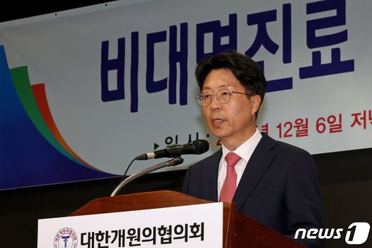 (서울=뉴스1) 장수영 기자 = 김동석 대한개원의협의회 회장이 6일 오후 서울 용산구 대한의사협회 대강당에서 비대면진료 시범사업 폐기 기자회견을 하고 있다. 대한개원의협의회는 보건복지부가 의사들과 협의 없이 일방적으로 비대면 진료를 대폭 확대한다는 내용에 참여 거부 선언할 수 있음을 밝혔다. 2023.12.6/뉴스1
