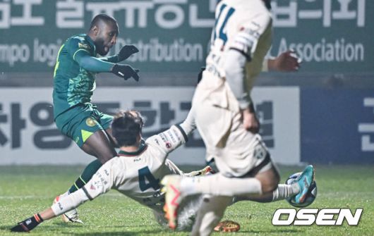 [OSEN=김포, 박준형 기자] 6일김포솔터축구장에서 하나원큐 K리그 2023 승강 플레이오프 1차전 김포FC와 강원FC의 경기가 진행됐다 김포는 올 시즌 K리그2 3위로 시즌을 마무리했고 강원은 K리그1 10위를 기록한 팀이다. 전반 김포FC 루이스가 강원 서민우의 태클에 걸려 슛찬스를 놓치고 있다. 2023.12.06 / soul1014@osen.co.kr