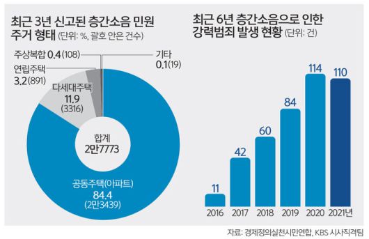 층간소음으로 인한 강력범죄도 늘어나고 있다. 경실련이 KBS 시사직격팀으로부터 받은 2016∼2021년 6년간 층간소음 관련 형사사건 판결문 분석에 따르면 층간소음이 만든 살인·폭력 등 5대 강력범죄는 2016년 11건에서 2021년 110건으로 10배 증가했다.