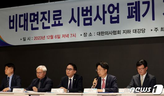 (서울=뉴스1) 장수영 기자 = 김동석 대한개원의협의회 회장 및 부회장들이 6일 오후 서울 용산구 대한의사협회 대강당에서 비대면진료 시범사업 폐기 기자회견을 하고 있다. 대한개원의협의회는 보건복지부가 의사들과 협의 없이 일방적으로 비대면 진료를 대폭 확대한다는 내용에 참여 거부 선언할 수 있음을 밝혔다. 2023.12.6/뉴스1