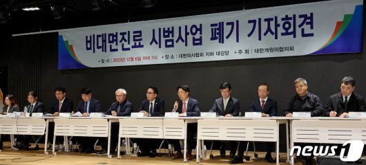 (서울=뉴스1) 장수영 기자 = 김동석 대한개원의협의회 회장 및 부회장들이 6일 오후 서울 용산구 대한의사협회 대강당에서 비대면진료 시범사업 폐기 기자회견을 하고 있다. 대한개원의협의회는 보건복지부가 의사들과 협의 없이 일방적으로 비대면 진료를 대폭 확대한다는 내용에 참여 거부 선언할 수 있음을 밝혔다. 2023.12.6/뉴스1