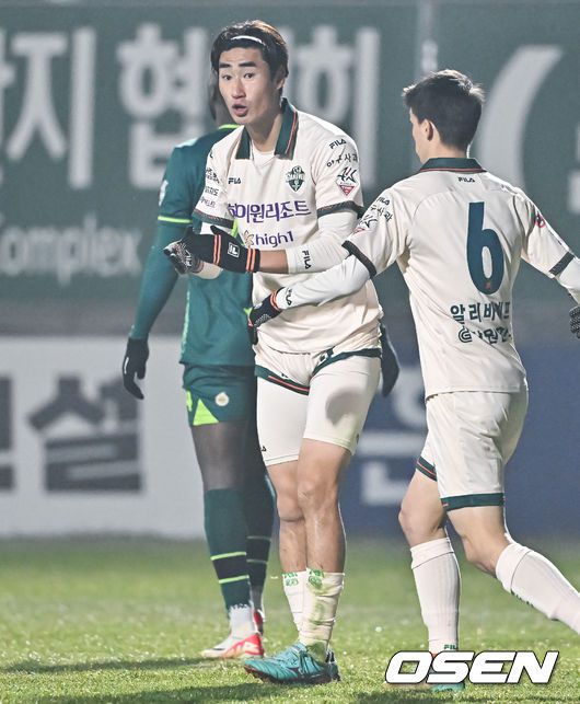 [OSEN=김포, 박준형 기자] 6일김포솔터축구장에서 하나원큐 K리그 2023 승강 플레이오프 1차전 김포FC와 강원FC의 경기가 진행됐다 김포는 올 시즌 K리그2 3위로 시즌을 마무리했고 강원은 K리그1 10위를 기록한 팀이다. 전반 강원 서민우가 김포FC 루이스의 슛을 막은뒤 동료들을 독려하고 있다. 2023.12.06 / soul1014@osen.co.kr