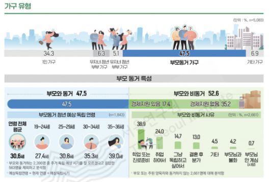 부모와 동거하는 청년의 예상 독립 나이는 평균 30.6세로 나타났다. 연령별 예상 독립 나이는 19∼24세는 27.4세, 25∼29세 30.8세, 30∼34세 35.3세, 35∼36세 39.0세로 나이가 들수록 예상 독립 시기도 계속 늘어나는 경향을 보였다.