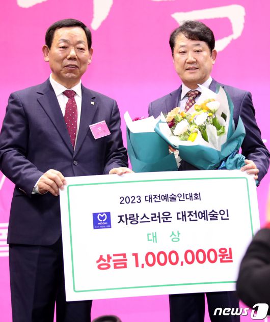 (대전=뉴스1) 김기태 기자 = 6일 오후 대전 유성구 호텔ICC에서 열린 한국예총 대전연합회 '2023 대전예술인대회'에서 성낙원 대전예총 회장이 김완하 전 한남대 교수에게 자랑스러운 대전예술인 대상을 수여한 뒤 기념촬영 하고 있다. 2023.12.6/뉴스1