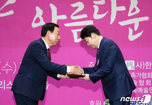 (대전=뉴스1) 김기태 기자 = 6일 오후 대전 유성구 호텔ICC에서 열린 한국예총 대전연합회 '2023 대전예술인대회'에서 성낙원 대전예총 회장이 김완화 전 한남대 교수에게 자랑스러운 대전예술인 대상을 수여하고 있다. 2023.12.6/뉴스1presskt@news1.krCopyright ⓒ 뉴스1. All rights reserved. 무단 전재 및 재배포, AI학습 이용 금지.