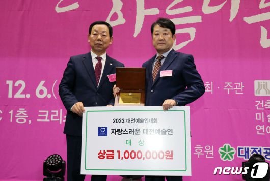 (대전=뉴스1) 김기태 기자 = 6일 오후 대전 유성구 호텔ICC에서 열린 한국예총 대전연합회 '2023 대전예술인대회'에서 성낙원 대전예총 회장이 김완하 전 한남대 교수에게 자랑스러운 대전예술인 대상을 수여한 뒤 기념촬영 하고 있다. 2023.12.6/뉴스1