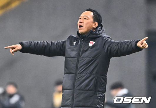 [OSEN=부산, 이석우 기자] 6일 부산아시아드주경기장에서 K리그 승강 플레이오프(PO) 1차전 부산 아이파크와 수원FC의 경기가 열렸다. 부산 아이파크 박진섭 감독이 선수들을 독려하고 있다. 2023.12.06 / foto0307@osen.co.kr