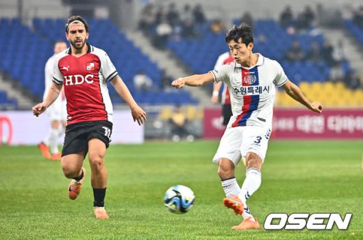 [OSEN=부산, 이석우 기자] 6일 부산아시아드주경기장에서 K리그 승강 플레이오프(PO) 1차전 부산 아이파크와 수원FC의 경기가 열렸다. 수원FC 박철우가 슛을 시도하고 있다. 2023.12.06 / foto0307@osen.co.kr