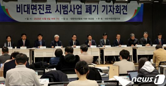 (서울=뉴스1) 장수영 기자 = 김동석 대한개원의협의회 회장 및 부회장들이 6일 오후 서울 용산구 대한의사협회 대강당에서 비대면진료 시범사업 폐기 기자회견을 하고 있다. 대한개원의협의회는 보건복지부가 의사들과 협의 없이 일방적으로 비대면 진료를 대폭 확대한다는 내용에 참여 거부 선언할 수 있음을 밝혔다. 2023.12.6/뉴스1