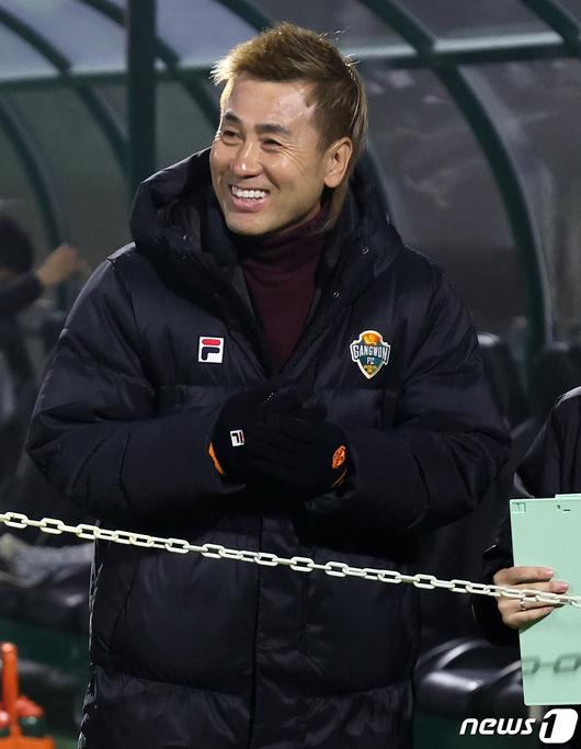 (김포=뉴스1) 김진환 기자 = 6일 오후 경기 김포 솔터축구장에서 열린 하나원큐 K리그 승강 플레이오프 1차전 김포FC와 강원FC의 경기, 김병지 강원FC 단장이 입장하는 선수들을 보며 미소짓고 있다. 2023.12.6/뉴스1kwangshinQQ@news1.krCopyright ⓒ 뉴스1. All rights reserved. 무단 전재 및 재배포, AI학습 이용 금지.
