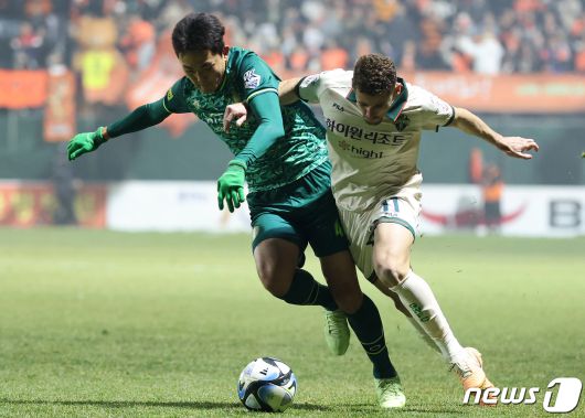 (김포=뉴스1) 김진환 기자 = 6일 오후 경기 김포 솔터축구장에서 열린 하나원큐 K리그 승강 플레이오프 1차전 김포FC와 강원FC의 경기, 강원FC 갈레오와 김포FC 김태한이 전반 치열한 볼 경합을 벌이고 있다. 2023.12.6/뉴스1
