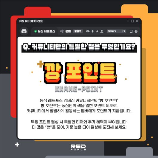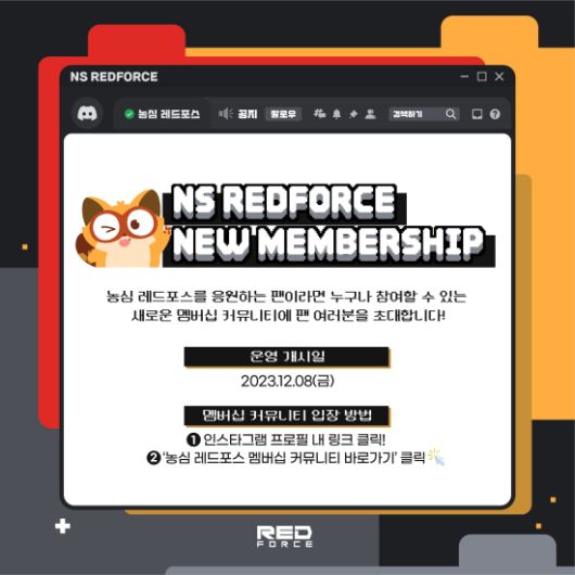 12월 8일 공식 오픈하는 새로운 디스코드 멤버십 채널에는 '리그 오브 레전드', '발로란트', '배틀그라운드 모바일' 선수단이 참여한다. 또한 농심 레드포스의 파트너 스트리머 '얏따'와 '농관전'도 채널에서 소통한다.