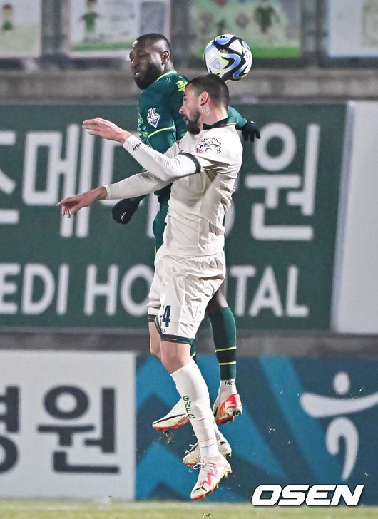 [OSEN=김포, 박준형 기자] 6일김포솔터축구장에서 하나원큐 K리그 2023 승강 플레이오프 1차전 김포FC와 강원FC의 경기가 진행됐다 김포는 올 시즌 K리그2 3위로 시즌을 마무리했고 강원은 K리그1 10위를 기록한 팀이다. 전반 김포FC 루이스와 강원FCFC 강투지가 공중볼을 다투고 있다. . 2023.12.06 / soul1014@osen.co.kr