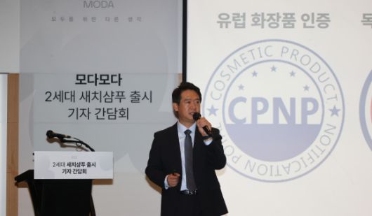 위해성 논란 겪은 모다모다, 새치샴푸 신제품 출시…“THB 없다” - 26일 서울 강남구 삼성동 인터컨티넨탈 코엑스 호텔에서 열린 모다모다, 비즈니스 전략 발표 및 신제품 출시 간담회에서 제품 소개 및 경영 전략을 발표하고 있다. 2023.10.26 연합뉴스 |
