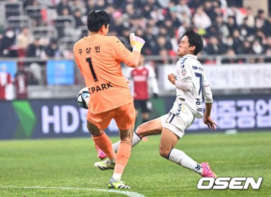 [OSEN=부산, 이석우 기자] 6일 부산아시아드주경기장에서 K리그 승강 플레이오프(PO) 1차전 부산 아이파크와 수원FC의 경기가 열렸다. 수원FC 김도윤이 부산 아이파크 구상민 골키퍼와 충돌하고 있다. 2023.12.06 / foto0307@osen.co.kr