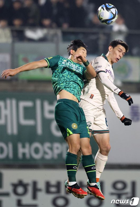 (김포=뉴스1) 김진환 기자 = 6일 오후 경기 김포 솔터축구장에서 열린 하나원큐 K리그 승강 플레이오프 1차전 김포FC와 강원FC의 경기, 강원FC 알리바예프와 김포FC 송준석이 전반 치열한 헤딩 경합을 벌이고 있다. 2023.12.6/뉴스1kwangshinQQ@news1.krCopyright ⓒ 뉴스1. All rights reserved. 무단 전재 및 재배포, AI학습 이용 금지.