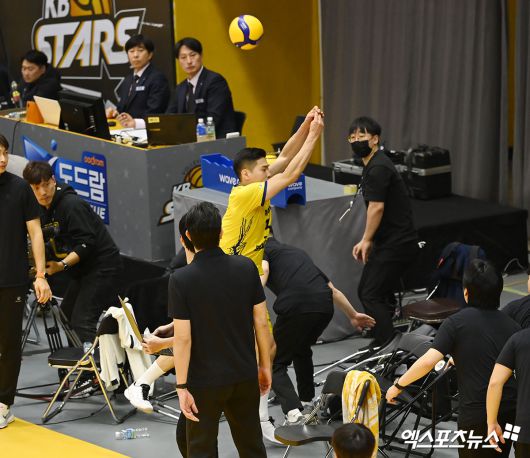 (엑스포츠뉴스 의정부, 김한준 기자) 6일 오후 경기도 의정부실내체육관에서 열린 ‘도드람 2023-2024 V-리그’ KB손해보험과 OK금융그룹의 경기, KB손해보험 황승빈이 디그를 하고 있다.김한준 기자 kowel@xportsnews.com