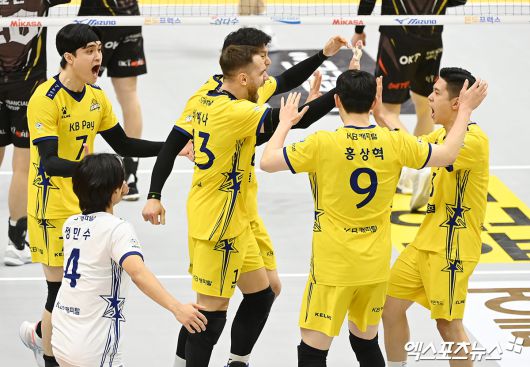 (엑스포츠뉴스 의정부, 김한준 기자) 6일 오후 경기도 의정부실내체육관에서 열린 ‘도드람 2023-2024 V-리그’ KB손해보험과 OK금융그룹의 경기, KB손해보험 선수들이 득점 후 기뻐하고 있다.