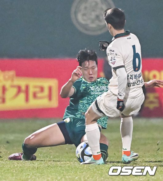 [OSEN=김포, 박준형 기자] 6일김포솔터축구장에서 하나원큐 K리그 2023 승강 플레이오프 1차전 김포FC와 강원FC의 경기가 진행됐다 김포는 올 시즌 K리그2 3위로 시즌을 마무리했고 강원은 K리그1 10위를 기록한 팀이다. 전반 김포FC 조성권이 태클로 공을 빼앗고 있다.2023.12.06 / soul1014@osen.co.kr