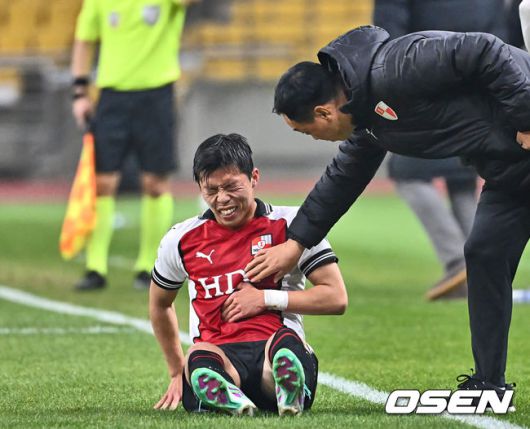 [OSEN=부산, 이석우 기자] 6일 부산아시아드주경기장에서 K리그 승강 플레이오프(PO) 1차전 부산 아이파크와 수원FC의 경기가 열렸다. 부산 아이파크 박진섭 감독이 성호영의 부상 정도를 파악하고 있다. 2023.12.06 / foto0307@osen.co.kr