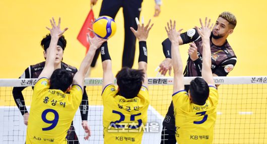 OK 레오가 6일 의정부체육관에서 열린 2023 도드람 V리그 남자부 KB손해보험과 OK금융그룹과의 경기에서 KB 삼중블로킹을 따돌리며 공격을 성공하고 있다. 2023.12.06.의정부 | 강영조기자 kanjo@sportsseoul.com [기사제보 news@sportsseoul.com] Copyright ⓒ 스포츠서울&sportsseoul.com
