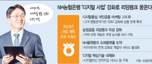 농협은행의 '2024년 경영계획'에 따르면 내년도 주요 경영 방침은 △디지털중심 개인금융 마케팅 강화 △농업금융 리딩뱅크 위상 강화 △NH올원뱅크 슈퍼플랫폼 도약을 위한 프로세스 개선 △디지털 핵심 기술 내재화 및 금융서비스 확대 △금융소비자보호 및 내부통제 강화 등으로 요약된다.
