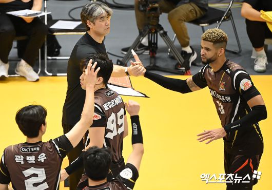 (엑스포츠뉴스 의정부, 김한준 기자) 6일 오후 경기도 의정부실내체육관에서 열린 ‘도드람 2023-2024 V-리그’ KB손해보험과 OK금융그룹의 경기, OK금융그룹 레오가 득점 후 오기노 감독과 하이파이브를 하고 있다.김한준 기자 kowel@xportsnews.com