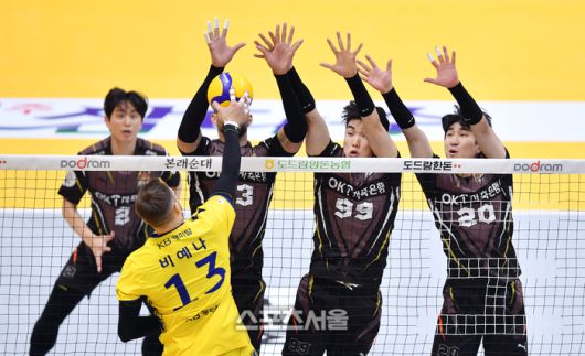 KB 비예나가 6일 의정부체육관에서 열린 2023 도드람 V리그 남자부 KB손해보험과 OK금융그룹과의 경기에서 OK 삼중블로킹을 상대로 연타공격을 성공하고 있다. 2023.12.06.의정부 | 강영조기자 kanjo@sportsseoul.com [기사제보 news@sportsseoul.com] Copyright ⓒ 스포츠서울&sportsseoul.com