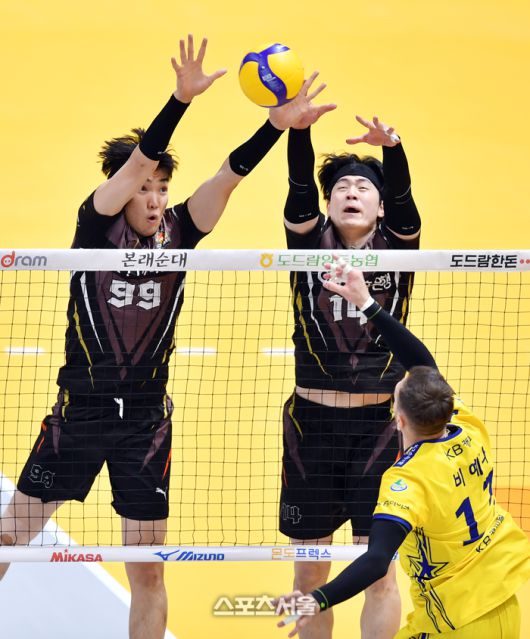KB 비예나가 6일 의정부체육관에서 열린 2023 도드람 V리그 남자부 KB손해보험과 OK금융그룹과의 경기에서 OK 바야르사이한에 막히고 있다. 2023.12.06.의정부 | 강영조기자 kanjo@sportsseoul.com [기사제보 news@sportsseoul.com] Copyright ⓒ 스포츠서울&sportsseoul.com