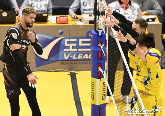 (엑스포츠뉴스 의정부, 김한준 기자) 6일 오후 경기도 의정부실내체육관에서 열린 ‘도드람 2023-2024 V-리그’ KB손해보험과 OK금융그룹의 경기, OK금융그룹 레오가 공격을 시도하고 있다.