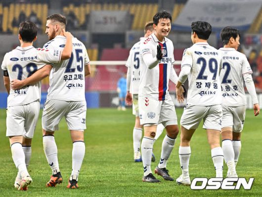 [OSEN=부산, 이석우 기자] 6일 부산아시아드주경기장에서 K리그 승강 플레이오프(PO) 1차전 부산 아이파크와 수원FC의 경기가 열렸다. 수원FC 장재웅이 골을 성공시키고 김현과 기뻐하고 있다. 2023.12.06 / foto0307@osen.co.kr