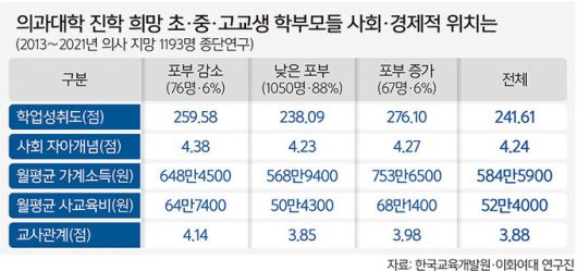 아울러 포부증가 집단 학생들은 대체로 자아개념 사회영역 인식이 낮고 학업영역 인식이 높은 것으로 나타났다. 연구진은 “포부증가 집단의 경우 학업성취도나 부모 월소득·사교육비는 물론 자녀에 대한 부모의 교육기대, 정서적 지원이 상당한 것으로 분석됐다”고 설명했다. 이어 “의사를 희망하는 학생들의 자아개념 중 사회영역을 증진시키기 위한 교육프로그램이 필요함을 시사한다”고 조언했다.