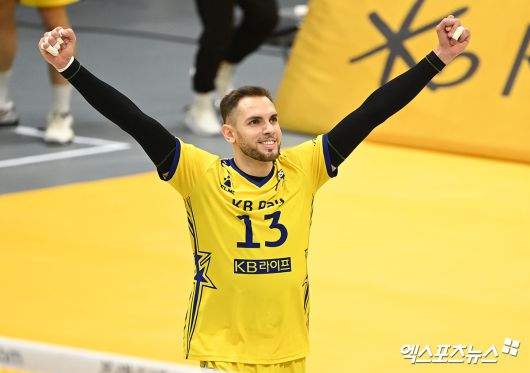 (엑스포츠뉴스 의정부, 김한준 기자) 6일 오후 경기도 의정부실내체육관에서 열린 ‘도드람 2023-2024 V-리그’ KB손해보험과 OK금융그룹의 경기, KB손해보험 비예나가 득점 후 기뻐하고 있다.