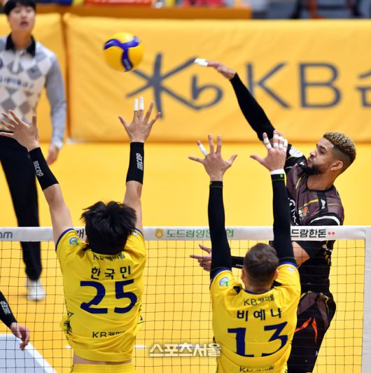 OK 레오가 6일 의정부체육관에서 열린 2023 도드람 V리그 남자부 KB손해보험과 OK금융그룹과의 경기에서 KB 이중블로킹을 피해 대각선 공격을 시도하고 있다. 2023.12.06.의정부 | 강영조기자 kanjo@sportsseoul.com [기사제보 news@sportsseoul.com] Copyright ⓒ 스포츠서울&sportsseoul.com