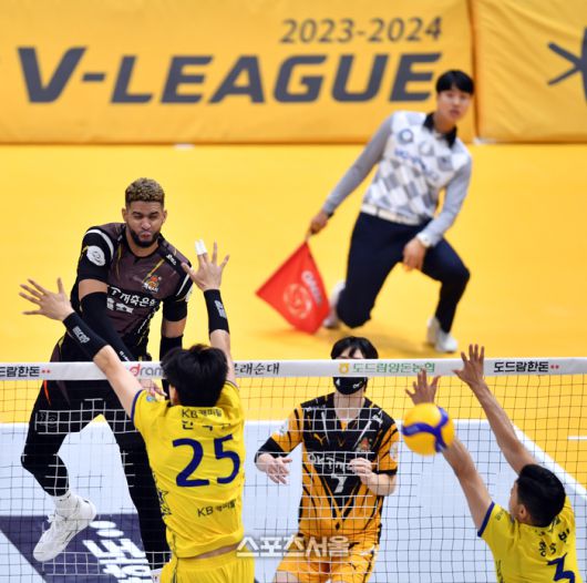 OK 레오가 6일 의정부체육관에서 열린 2023 도드람 V리그 남자부 KB손해보험과 OK금융그룹과의 경기에서 KB 이중블로킹을 따돌리며 후위공격을 시도하고 있다. 2023.12.06.의정부 | 강영조기자 kanjo@sportsseoul.com [기사제보 news@sportsseoul.com] Copyright ⓒ 스포츠서울&sportsseoul.com