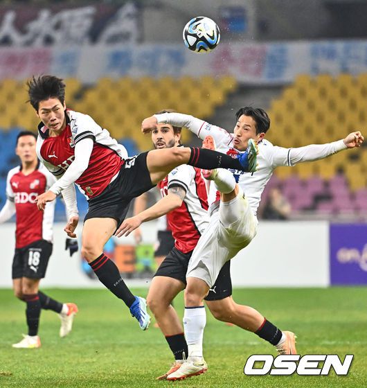 [OSEN=부산, 이석우 기자] 6일 부산아시아드주경기장에서 K리그 승강 플레이오프(PO) 1차전 부산 아이파크와 수원FC의 경기가 열렸다. 수원FC 김선민과 부산 아이파크 강상윤이 볼을 다투고 있다. 2023.12.06 / foto0307@osen.co.kr