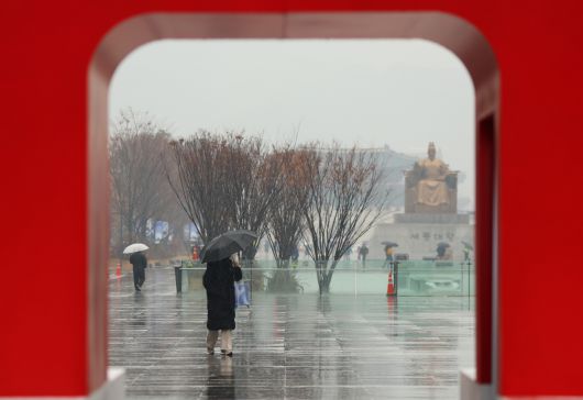 절기상 대설을 하루 앞두고 전국 곳곳에 비가 내린 6일 오후 서울 광화문광장에서 우산을 쓴 시민이 길을 지나고 있다. 연합뉴스 |