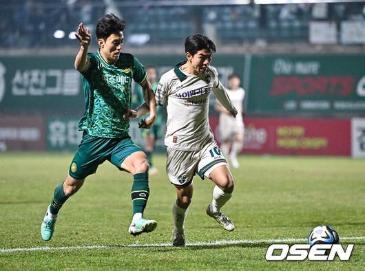 [OSEN=김포, 박준형 기자] 6일김포솔터축구장에서 하나원큐 K리그 2023 승강 플레이오프 1차전 김포FC와 강원FC의 경기가 진행됐다 김포는 올 시즌 K리그2 3위로 시즌을 마무리했고 강원은 K리그1 10위를 기록한 팀이다. 후반 강원FC 김대원과 김포FC 김이석이 공을 다투고 있다. . 2023.12.06 / soul1014@osen.co.kr