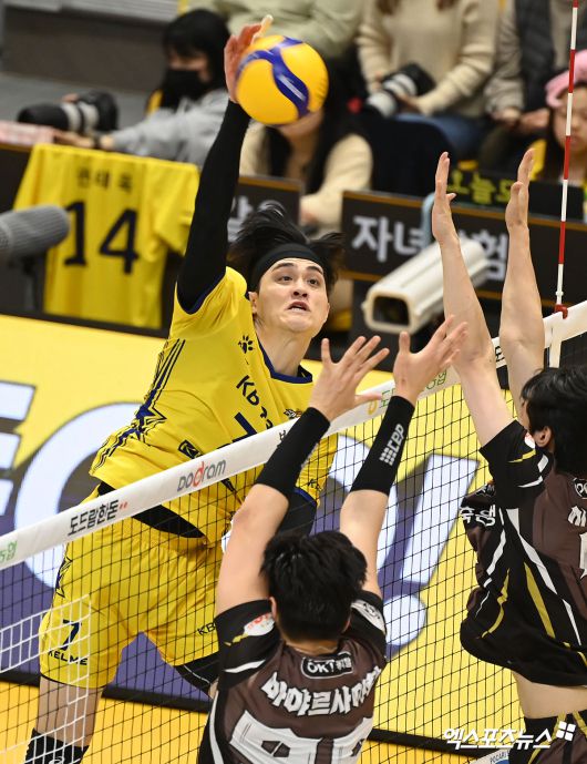(엑스포츠뉴스 의정부, 김한준 기자) 6일 오후 경기도 의정부실내체육관에서 열린 ‘도드람 2023-2024 V-리그’ KB손해보험과 OK금융그룹의 경기, KB손해보험 리우홍민이 공격을 시도하고 있다.김한준 기자 kowel@xportsnews.com
