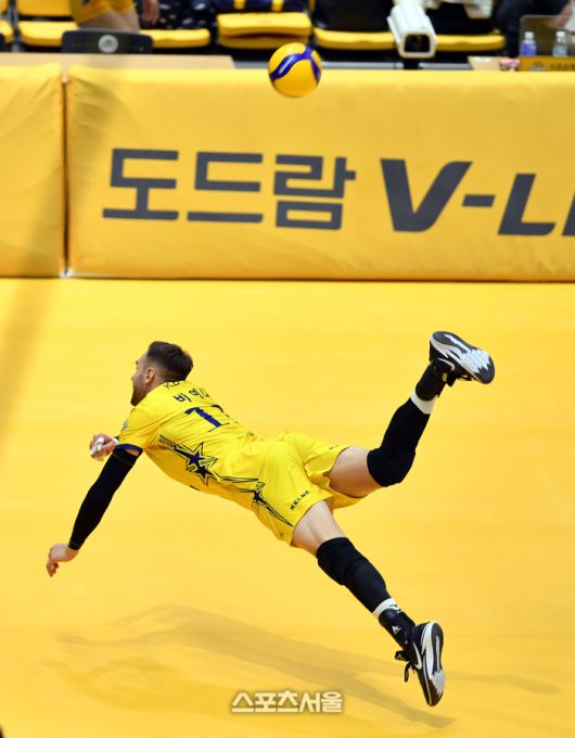 KB 비예나가 6일 의정부체육관에서 열린 2023 도드람 V리그 남자부 KB손해보험과 OK금융그룹과의 경기에서 터치아웃되는 볼을 살려내고 있다. 2023.12.06.의정부 | 강영조기자 kanjo@sportsseoul.com [기사제보 news@sportsseoul.com] Copyright ⓒ 스포츠서울&sportsseoul.com