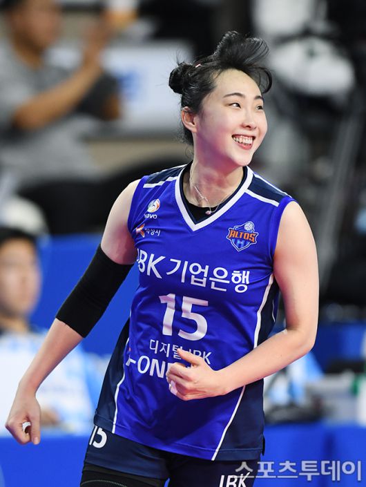IBK기업은행 황민경이 공격 성공 후 기뻐하고 있다.