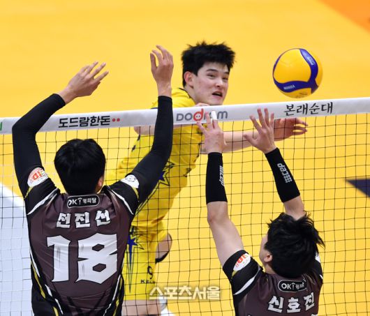 KB 홍상혁이 6일 의정부체육관에서 열린 2023 도드람 V리그 남자부 KB손해보험과 OK금융그룹과의 경기에서 OK 이중블로킹을 피해 밀어넣기를 시도하고 있다. 2023.12.06.의정부 | 강영조기자 kanjo@sportsseoul.com [기사제보 news@sportsseoul.com] Copyright ⓒ 스포츠서울&sportsseoul.com
