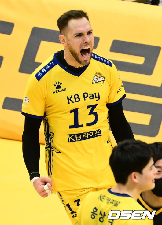 [OSEN=의정부, 조은정 기자]6일 오후 경기도 의정부시 의정부실내체육관에서 ‘도드람 2023-2024 V-리그’ 남자부 3라운드 KB손해보험과 OK금융그룹의 경기가 열렸다. 비예나를 비롯한 KB손해보험이 2세트 승리에 기뻐하고 있다. 2023.12.06 /cej@osen.co.kr