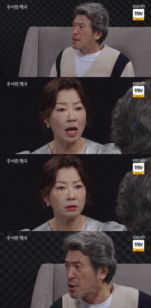 6일 저녁 방송된 KBS2 일일드라마 '우아한 제국'에서 장창성(남경읍)이 홍혜림(김서라)에게 장기윤(이시강)의 친부를 물었다.